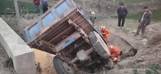 接警后,鄲城消防大隊(duì)立即出動3輛消防車15名指戰(zhàn)員前往處置。經(jīng)偵查發(fā)現(xiàn),側(cè)翻車輛是一輛農(nóng)用三輪車,車上拉有約2噸散裝玉米。現(xiàn)場玉米灑落一地,駕駛員約六十歲,左腿被農(nóng)用三輪車前輪壓住,無法脫身,加之即將天黑,當(dāng)時天氣較冷,如不及時處置,后果不堪設(shè)想。