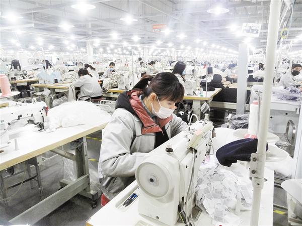 2月26日,商水縣阿爾本制衣有限公司的員工正在生產車間加工服裝。商水縣在嚴格做好疫情防控的同時,又做好企業(yè)復工復產工作。目前,該縣10家大型企業(yè)和6個扶貧車間有返崗人員3萬多人。喬連軍攝