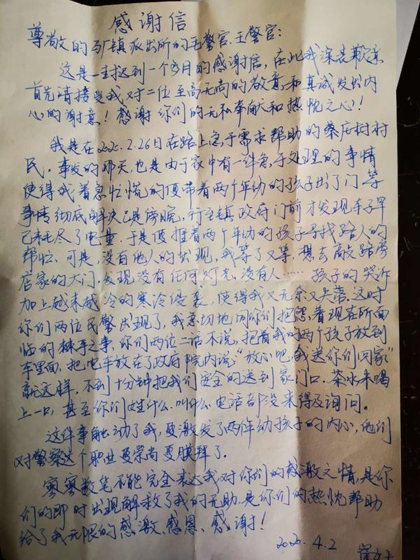 為向民警致謝,崔女士家人多次聯(lián)系馬廠派出所所長(zhǎng)毛衛(wèi)庚說(shuō)要表示感謝,都被婉言謝絕了。近日,已身在鄭州打工的崔女士每次想到那晚民警們對(duì)她們的幫助都心存感激,于是她就手寫了一封感謝信,并制作了一面錦旗,從鄭州郵寄到家里,讓親戚幫忙送到馬廠派出所以示感謝。