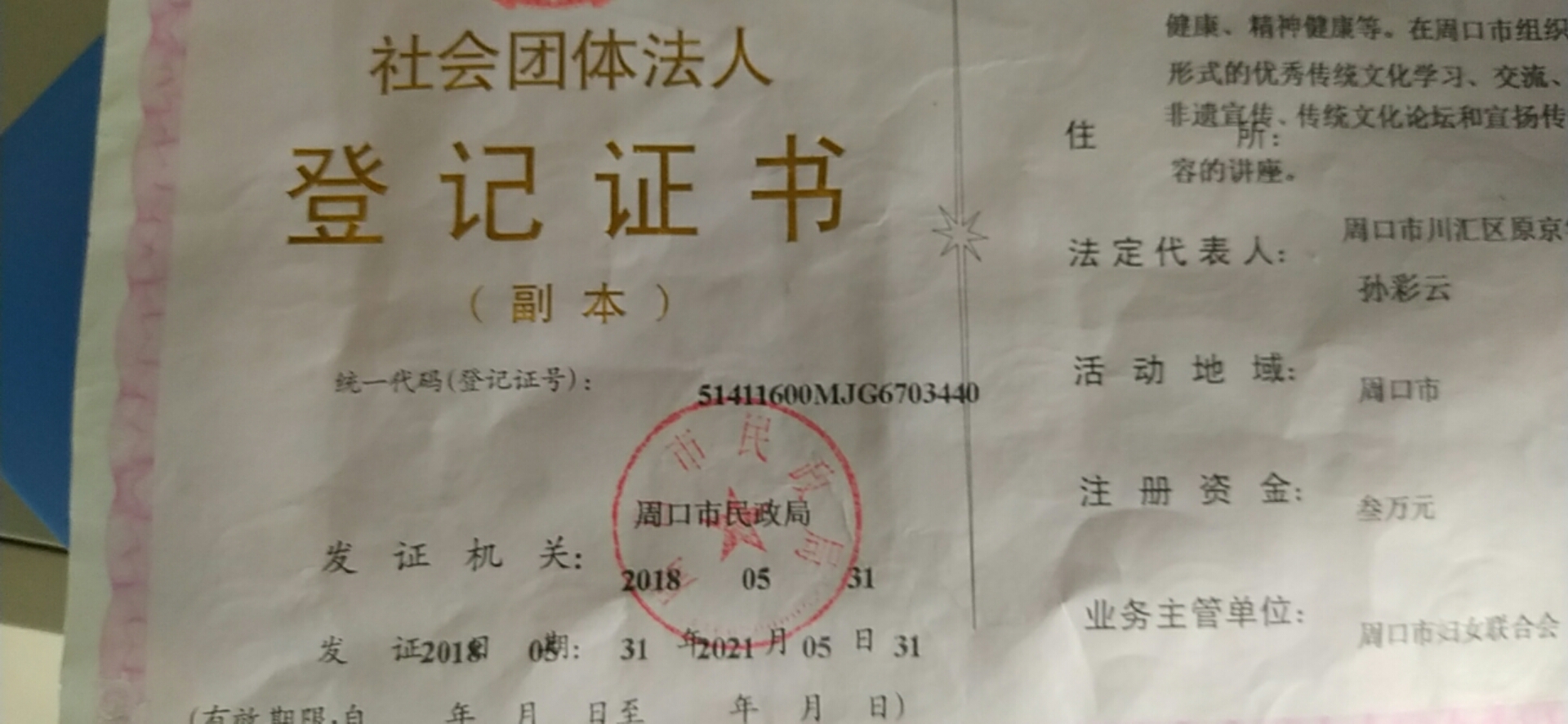 當孫彩云把成立志愿者團體的想法在微信群里公布后,得到了群友們的積極響應(yīng)??擅耖g志愿團體只有熱情是不夠的,憑著不達目的誓不罷休的性格,孫彩云一家家尋找掛靠單位,功夫不負有心人,她的毅力感動了周口市婦聯(lián)。在市婦聯(lián)的支持下,2017年4月28日,組織定名“周口市慈孝文化促進會”,同年5月8日,首次護河行動在大鐵牛下舉行,成為守護母親河的起點。2018年5月31日,周口市民政局批示下發(fā)“社會團體法人登記證書”,慈孝文化促進會正式成為國家注冊社會組織。