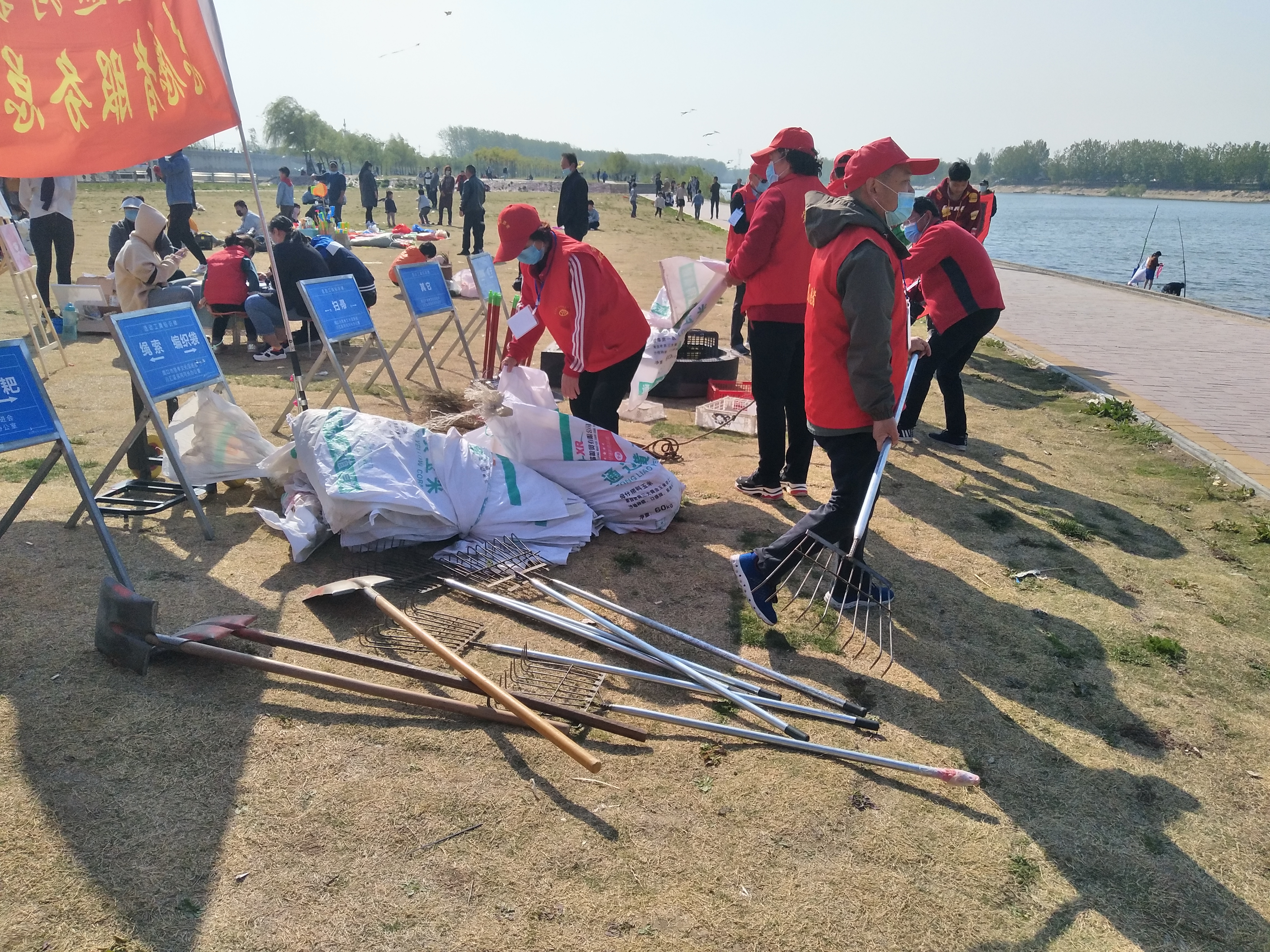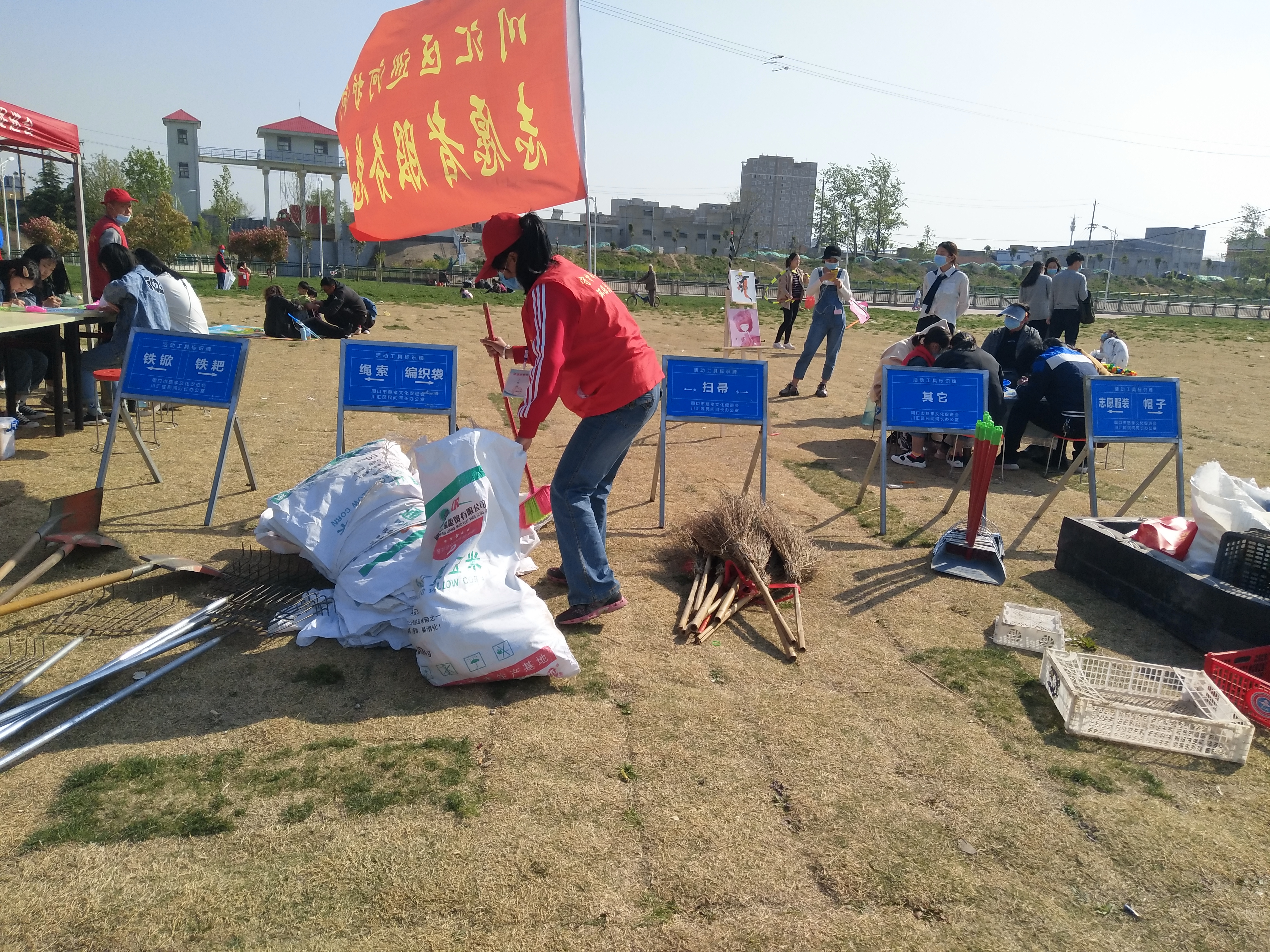 問卷棚旁是擺放整齊的河面垃圾清理工具,鐵锨、鐵耙、繩索、編織袋、掃帚、垃圾箱一字排開,寫有“川匯區(qū)巡河護河”、“志愿者服務(wù)總隊”字樣的紅旗迎風(fēng)飛揚。記者向志愿者借了身衣服,和大家一起等著護河總指揮孫彩云分工。