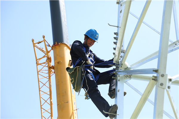 4月25日,在商水縣姚集鄉(xiāng)朱莊村附近的麥地里,國(guó)網(wǎng)周口供電公司的施工人員正在緊張組裝110千伏線路鐵塔,為110千伏白寺變電站順利投運(yùn)奠定基礎(chǔ)。