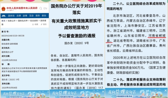 5月8日,中華人民共和國中央人民政府門戶網站發(fā)布《國務院辦公廳關于對2019年落實有關重大政策措施真抓實干成效明顯地方予以督查激勵的通報》國辦發(fā)〔2020〕9號文件,對213個地方予以督查激勵,相應采取30項獎勵支持措施。其中,鄲城縣榮登“對公立醫(yī)院綜合改革成效較為明顯的地方”名錄,獲獎500萬元。