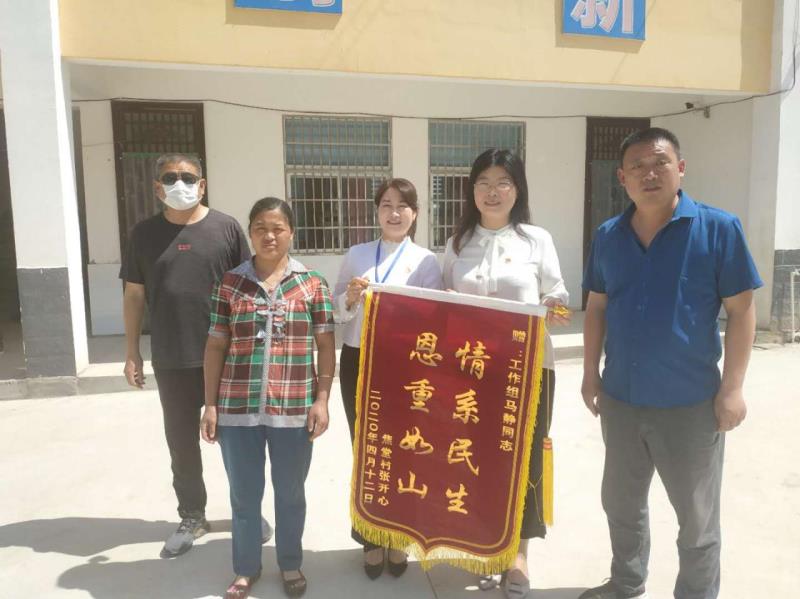 5月19日,太康縣王集鄉(xiāng)焦堂行政村張草帽自然村村民萬勤霞來到焦堂村小學(xué),將一面繡有“情系民生 恩重如山”的錦旗送到了該縣紀(jì)委常委、監(jiān)委委員馬靜,工作組成員王向花、馬景華、張海亮手中,感動的淚水忍不住地流。