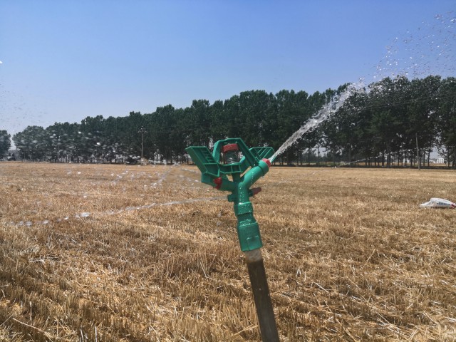 去年年初,這片田地里的機井全部通電了。展元廠覺得現(xiàn)在澆地真的方便多了。他騎著小三輪車把水管、電機拉到地頭,幾分鐘接好電表、接通電線,擺好滴灌管,嘩嘩的井水隨即就噴灑到田里?!跋霛驳耐敢恍?,就多噴一會兒。電費才4毛多錢一度,隨便用也花不了多少錢?!闭乖獜S只需要隔一段時間,挪一挪管子,沒事的時候他甚至可以坐在地頭的樹蔭下休息休息。