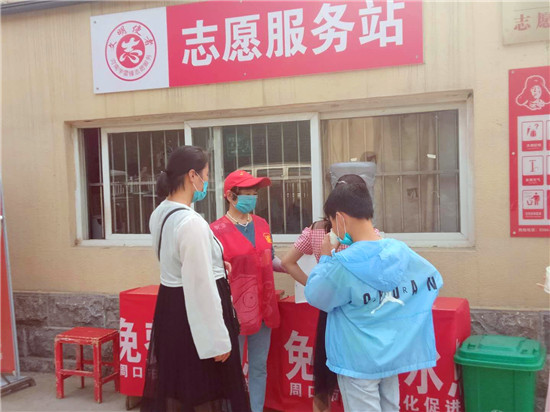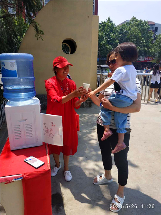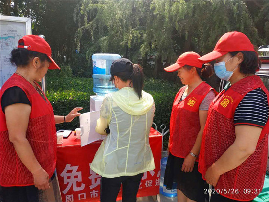 6月3日,在周口中心城區(qū)七一路上的周口人民公園附近,由市慈孝文化促進會的志愿者設立的免費飲水點前,不少市民正在接水喝,為炎炎夏日里的市民送上一份清涼。 記者 張洪濤攝