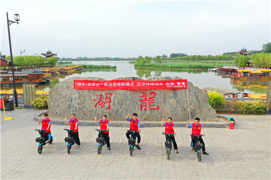 當日38度的高溫酷熱擋不住檢察干警守護淮陽河暢、水清、湖凈、岸綠、景美的決心和信心,30名檢察干警、志愿者騎電車圍湖宣傳,為市民進行相關政策的講解,號召市民熱愛龍湖,告知群眾及社會各界人士參與檢察公益保護的方式和途徑,公開聯(lián)系電話,微信公眾號,方便群眾通過多種渠道提供案件線索。