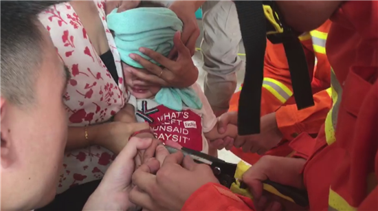 到達現(xiàn)場經詢問得知,小男孩由于貪玩,將一個細長鋼管卡在了右手大拇指上,小男孩的家人嘗試了一些方法無果后,向消防救援大隊請求了幫助。由于時間稍長,小男孩的手指已經浮腫,不停的哭泣,消防指戰(zhàn)員一邊尋求解決方法一邊安慰其情緒。經觀察后,指戰(zhàn)員首先利用斷線鉗將鋼管剪斷,然后用擴張器小心翼翼的進行擴張,經過2分鐘緊張救援,成功將鋼管取下。