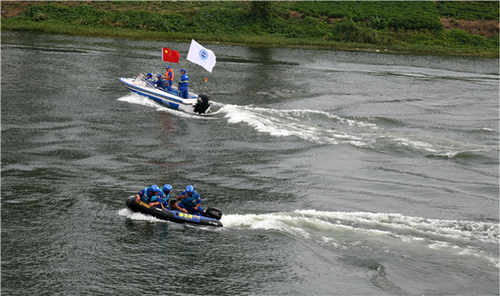 上午9時,隨著田林“開始演練”命令的下達,60人組成的搶險突擊隊,緊張有序開展了五個科目的演練。突擊隊員通過巡堤查險,觀察堤坡及堤腳附近有無滲水、管涌、裂縫、滑坡、漏洞等險情。發(fā)現險情后,迅速采取導滲、截滲等搶險措施,確保險情得到及時、正確、有效的處理或控制。發(fā)現落水人員,四艘沖鋒舟分工明確,立即前往落水地點進行救助。