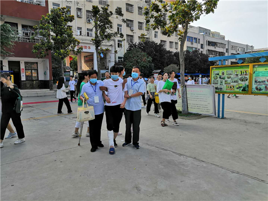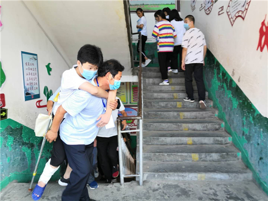 “終于到了,要不是身體好,還真不能一口氣把這孩子背上三樓?!编惓强h第三實(shí)驗(yàn)中學(xué)考務(wù)老師張子江邊擦汗邊笑著說。