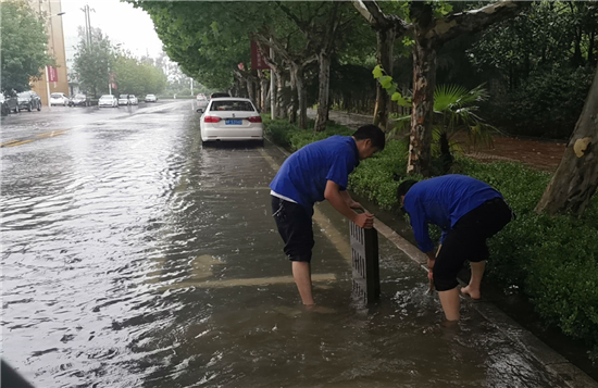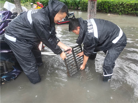 商水城管雨中疏通道路排水口