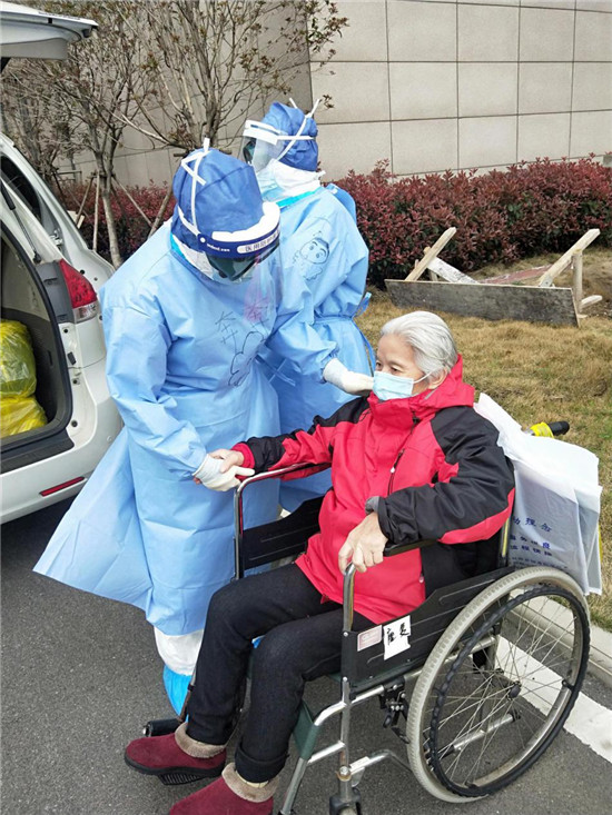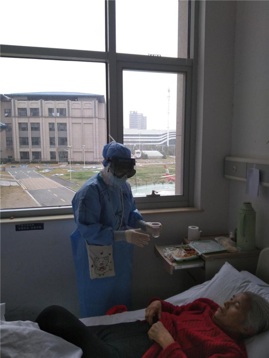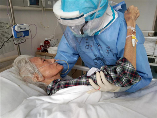 今年74歲的李秀紅,不僅感染新冠肺炎,而且罹患老年癡呆,生活需要時時照顧,而且剛?cè)朐簳r,對陌生環(huán)境的恐懼造成她心情壓抑,天天不說話,時不時落淚。為了讓老人放下心理包袱,胡奔奔在進行哄喂吃飯、服藥等正常護理之余,經(jīng)常陪老人聊天、唱歌,后來老人情緒明顯好轉(zhuǎn),還主動與胡奔奔一起扭起了舞蹈。后來,老人康復出院時,雖然無言 卻一直緊緊抓著胡奔奔的手久久不愿放開。胡奔奔說,那一刻,她落淚了,但心里確實說不出的高興。