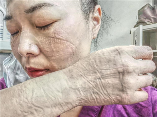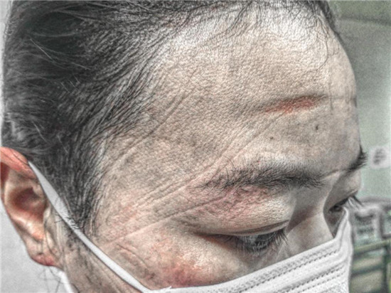 因為新冠肺炎的強傳染性,胡奔奔每次去病區(qū)上班都要全副武裝,而且為保證在6個小時的工作時間內(nèi)不被暴露,不能去衛(wèi)生間,不能喝水,還要穿上成人紙尿褲以防萬一。這樣下來,汗?jié)褚路浅J?,而且下班后脫掉防護裝備后,她原本清秀白皙的臉上,滿是深深的皺褶,久久難以恢復,惹人心疼。給家人報平安時,胡奔奔甚至不敢視頻聊天,只能語音安慰家人。