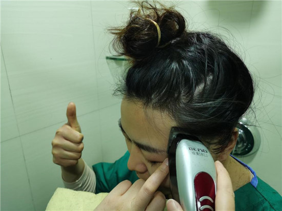 出征武漢之前,為減少感染自己、感染別人的風險,出生于1991年、和同齡人一樣愛美的胡奔奔毅然決定同意剃去一襲披肩長發(fā)。這頭秀發(fā),胡奔奔留了多年,曾經(jīng)看得跟生命一樣珍貴,但疫情險惡,她義無反顧。