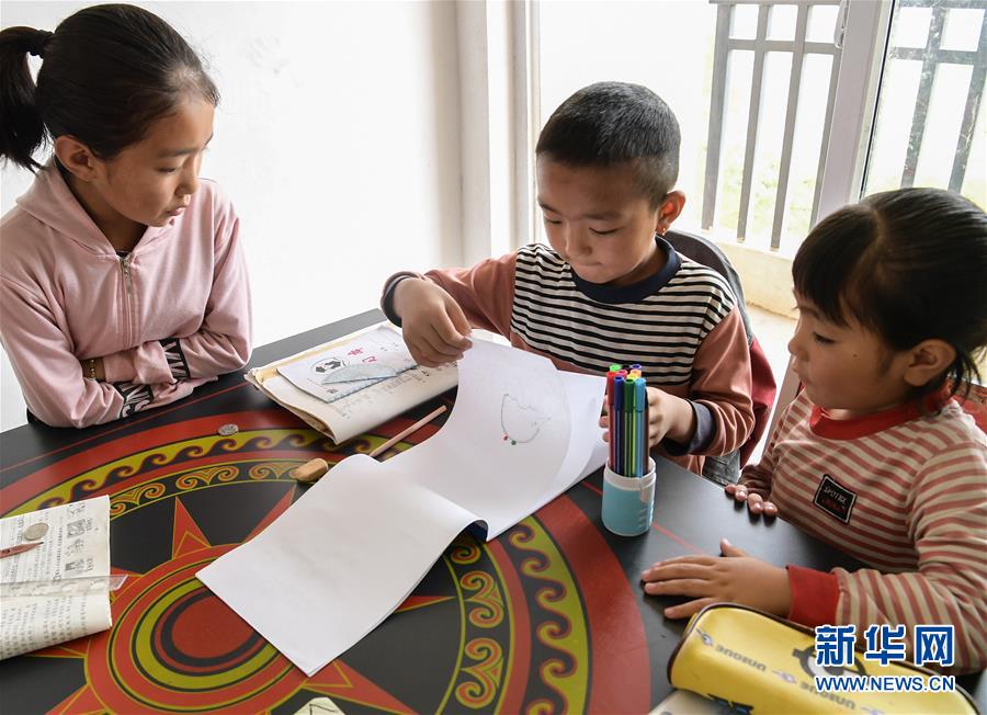 昭覺(jué)縣城城郊集中安置點(diǎn)南坪社區(qū)內(nèi),一戶彝族群眾家中的孩子圍坐在書(shū)桌旁畫(huà)畫(huà)(8月11日攝)。 新華社記者 李賀 攝