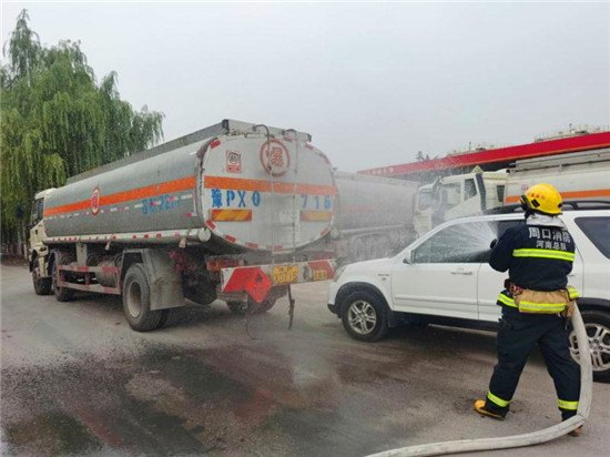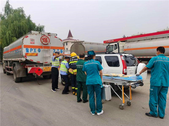 當(dāng)日上午10時,商水交警大隊指揮中心接到報警:在商水縣興商大道與陳勝大道交叉口西、湯莊油庫處,一輛轎車與一輛?;饭捃囎肺蚕嘧玻9摅w損壞,?;沸孤镀鸹穑I車駕駛室變形,駕駛?cè)吮焕к噧?nèi),如不及時救援,駕駛?cè)擞猩kU,另外因事故現(xiàn)場臨近湯莊油庫,如不及時處置可能發(fā)生爆炸,后果不堪設(shè)想。