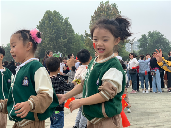 9月30日上午,在周口公園里,一群幼兒園的小朋友通過做游戲,涂畫卷等活動(dòng)歡度國(guó)慶節(jié)。②9