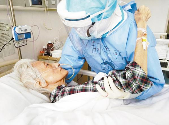 在武漢醫(yī)院,今年84歲的楊守振不僅感染新冠肺炎,而且有嚴重的營養(yǎng)不良,插著胃管,身體極為消瘦,生活不能自理。為了不讓老人出現壓瘡,胡奔奔需要每隔一個小時為老人翻一次身。翻身時候,為了讓老人更舒服一點,她每次都像抱孩子一樣把老人抱在懷里,動作輕柔地按摩老人受壓的部位,防止壓瘡的形成。