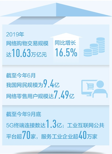 截至2020年6月,我國網(wǎng)民規(guī)模為9.4億,網(wǎng)絡零售用戶規(guī)模達7.49億。2019年網(wǎng)絡購物交易規(guī)模達10.63萬億元,同比增長16.5%。截至今年9月底,5G終端連接數(shù)達到1.3億;制造業(yè)數(shù)字化轉(zhuǎn)型穩(wěn)步前進,工業(yè)互聯(lián)網(wǎng)公共平臺超過70家,服務的工業(yè)企業(yè)超過40萬家……如今,數(shù)字經(jīng)濟蓬勃發(fā)展,成為經(jīng)濟發(fā)展的新增長點,產(chǎn)業(yè)數(shù)字化與數(shù)字產(chǎn)業(yè)化的基礎更加堅實,不斷為高質(zhì)量發(fā)展注入新動能。