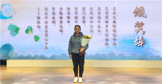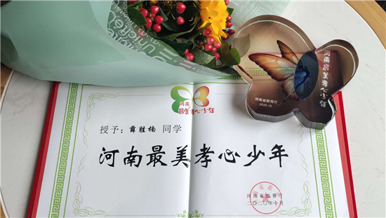“正是天真爛漫的年紀(jì),已有歷經(jīng)歲月的坦然。在苦難中成長(zhǎng),在風(fēng)雨中自強(qiáng)。寒門至孝,貧窮遮不住你內(nèi)心的光芒。嘗罷艱辛,方能破繭成蝶、百煉成鋼。你是‘河南最美孝心少年’——薛勝楠?!边@是組委會(huì)給薛勝楠的頒獎(jiǎng)詞。