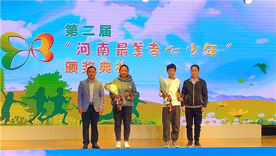 10月20日,河南省第二屆“河南最美孝心少年”頒獎(jiǎng)典禮在河南省實(shí)驗(yàn)學(xué)校鄭東小學(xué)舉行,全省表彰10名“河南最美孝心少年”,分別頒發(fā)獎(jiǎng)杯、證書和1萬(wàn)元獎(jiǎng)勵(lì)。省教育廳副廳長(zhǎng)毛杰等領(lǐng)導(dǎo)為孝心少年頒獎(jiǎng)并合影留念。鄲城縣汲水二中學(xué)生薛勝楠光榮受獎(jiǎng)。