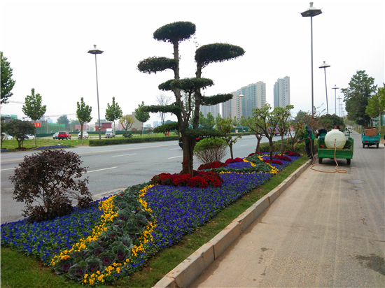 紅色、黃色、紫色的花兒,還有造型別致的景觀樹……10月21日,記者在周口中心城區(qū)七一東路上的一處綠化帶內(nèi)看到了這樣一組造型別致的景觀造型,扮靚了綠化帶,給人耳目一新的感覺。記者 張洪濤 攝
