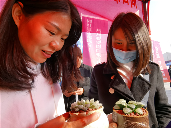 11月6日上午,周口市電商扶貧特色產(chǎn)品展銷會(huì)暨第一屆讀者節(jié)系列文化活動(dòng)剛開始,鄲城多肉盆栽、扶溝縣農(nóng)特產(chǎn)、沈丘縣顧家花饃等周口特產(chǎn)展位前人頭攢動(dòng)。此次活動(dòng)聚集了周口特色優(yōu)質(zhì)農(nóng)產(chǎn)品,吸引不少市民。