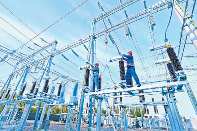 10月12日,甘肅省張掖市臨澤縣清潔能源供暖供電電網(wǎng)配套工程建設(shè)現(xiàn)場(chǎng),工作人員正在電塔上進(jìn)行最后的設(shè)備安裝調(diào)試?! ⊥?將攝(人民視覺(jué))