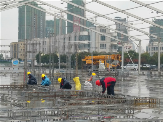 為迎接11月28日至30日舉辦的周商產(chǎn)品展示展覽活動,現(xiàn)場70余名施工人員不顧天氣惡劣,抓緊搶干工期,爭取在11月25日全面搭建完畢。