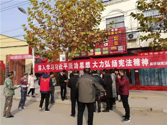 12月4日是第七個(gè)國(guó)家憲法宣傳日。為深入學(xué)習(xí)宣傳習(xí)近平法治思想,努力營(yíng)造和諧穩(wěn)定的鄉(xiāng)村環(huán)境和法治氛圍,推動(dòng)全鎮(zhèn)“深入學(xué)習(xí)宣傳習(xí)近平法治思想、大力弘揚(yáng)憲法精神”。崔橋鎮(zhèn)組織司法所、派出所等采取多種形式,開(kāi)展了憲法宣傳。