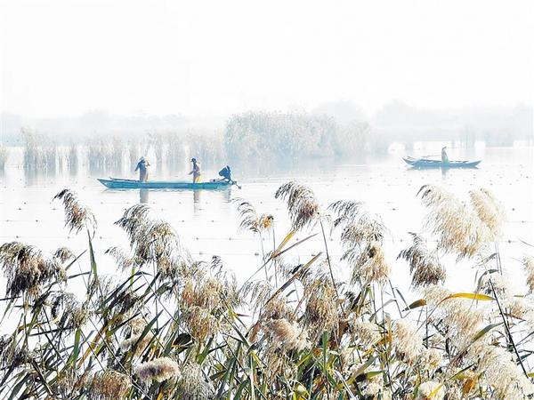 12月14日,兩艘冬捕的漁船在淮陽區(qū)龍湖布網(wǎng)捕魚。湖岸蘆葦搖曳,遠處薄霧蒙蒙,景色迷人,恰似水墨丹青。 記者 杜欣 攝