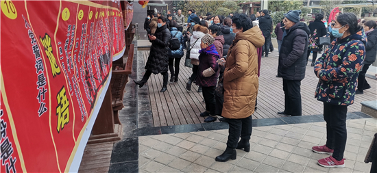一大早,來(lái)自川匯區(qū)文聯(lián)、區(qū)民協(xié)的工作人員,將金色東方社區(qū)的休閑廣場(chǎng)裝扮得格外喜慶,兩條帶有傳統(tǒng)紋飾圖案的噴繪印著謎語(yǔ)和黨的知識(shí),掛在休閑長(zhǎng)廊上,吸引著出來(lái)曬太陽(yáng)或散步的居民。區(qū)文聯(lián)黨組書(shū)記史濤,區(qū)文聯(lián)黨組成員、副主席游富華,區(qū)人和辦事處副書(shū)記武陽(yáng),市民協(xié)副主席羅營(yíng)東、區(qū)民協(xié)主席杜超,區(qū)民協(xié)秘書(shū)長(zhǎng)任建明等走進(jìn)社區(qū),參加這場(chǎng)活動(dòng)?!爸袊?guó)共產(chǎn)黨是什么時(shí)候成立的?”“1921年7月23日”“答對(duì)了,獎(jiǎng)洗衣液一壺!”游富華以問(wèn)答的形式和居民們互動(dòng),向居民們普及黨的知識(shí),居民們紛紛參與,氣氛活躍。