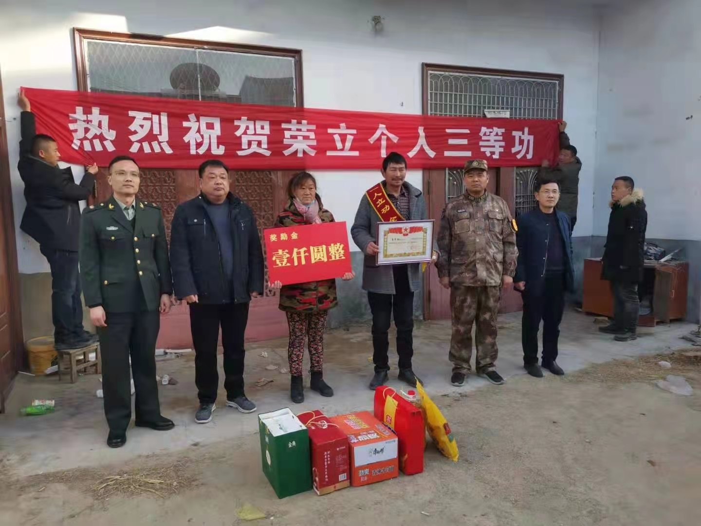 1月12日上午,西華縣西華營鎮(zhèn)雙樓村某部士官高志豪家中鑼鼓喧天,喜氣洋洋。該縣人武部政委涂友佳、縣退役軍人事務局局長龔坤敬一起把二等功喜報和“一人立功,全家光榮”的紅色綬帶及5000元現(xiàn)金等送到高志豪及其父母手中。