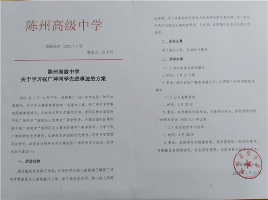 據陳州高中校長白子興介紹,該校已經向全校師生發(fā)起學習張廣坤先進事跡的倡議,以助人為樂為榮,熱心主動幫助他人。學校還將通過組織專題德育課、開展演講征文活動等,深入持久開展學習榜樣活動。