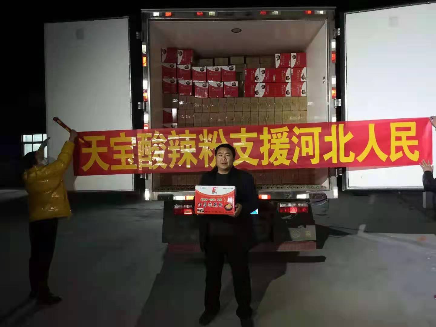 于是,他當(dāng)即與河北省南宮市相關(guān)防疫部門取得聯(lián)系,天宮那邊欣然接受,并表示感謝。1月20日當(dāng)夜,便組織召集村上的“鐵桿工人”連夜加班加點生產(chǎn)了價值5萬元共計1萬盒“天寶酸辣粉”,無償捐贈給河北天宮市,送去來自沈丘縣中豫天寶食品有限公司的一片愛心。