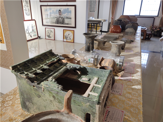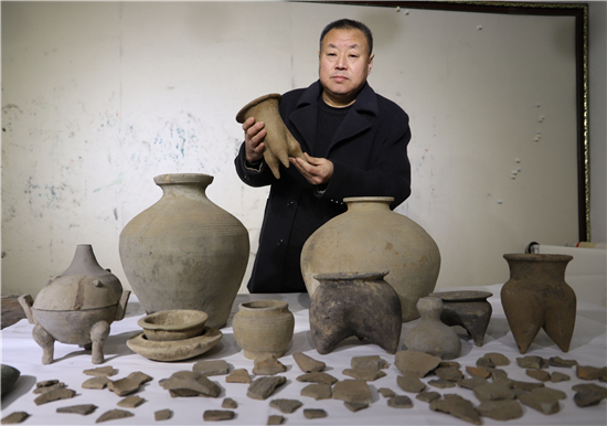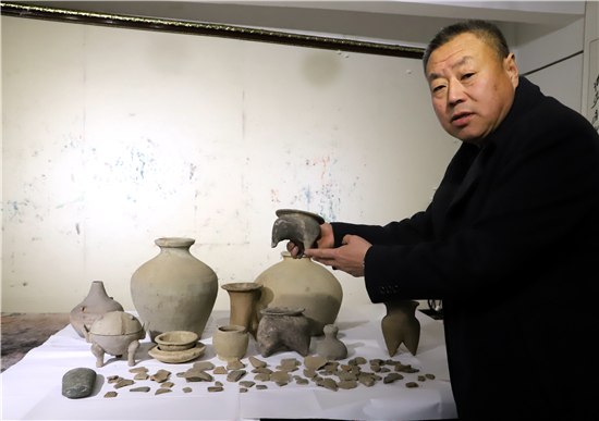 三足燉肉的陶鬲、圓形擦粉的粉盒、前方后圓的灶臺、帶孔過濾的茶罐、廣口大肚的糧罐、象形浮雕的方磚、雙耳大肚的水壺……1月31日,鄲城縣文聯(lián)副主席、收藏家協(xié)會會長閆振宇打開自己的“博物館”,將多年來在鄲城縣丁村鄉(xiāng)陶店村出土并收藏的數十件陶器向記者展示,以此進一步證明陶店遺址是龍山文化新時期石器遺址,疑為中國灰陶最早生產地,中國陶器之鄉(xiāng)。