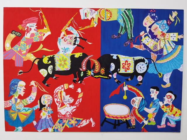 2020年4月,錢玉燕無意中看到“決勝全面小康”第二屆全國農(nóng)民畫展覽征稿啟事,對農(nóng)村生活非常熟悉的她決定一試。她立足于周口平原農(nóng)區(qū)的特色,深深領(lǐng)悟周口幾千年來的農(nóng)耕文化,對參賽作品進(jìn)行了認(rèn)真、系統(tǒng)地構(gòu)思,最終決定以歡慶豐收的斗?;顒訛轭}材,把農(nóng)耕文化的深遠(yuǎn)、厚重與豐富的藝術(shù)表現(xiàn)手法相融合。她采用普通的繪畫卡紙,運(yùn)用多種繪畫顏料,充分借鑒漢畫藝術(shù),吸收中原地區(qū)的剪紙文化、西方藝術(shù)大師畢加索立體畫派的藝術(shù)風(fēng)格和古埃及畫的靈感,以艷麗的紅、藍(lán)為主背景,采取夸張的表現(xiàn)手法,把斗牛的場景表現(xiàn)得淋漓盡致。作品創(chuàng)作發(fā)揮了豐富的想象力,人物動物造型借鑒中國民間藝術(shù)剪紙的方式表現(xiàn),以大膽、夸張、強(qiáng)烈的色彩搭配,把無限深廣的空間“壓扁”到一個平面上。