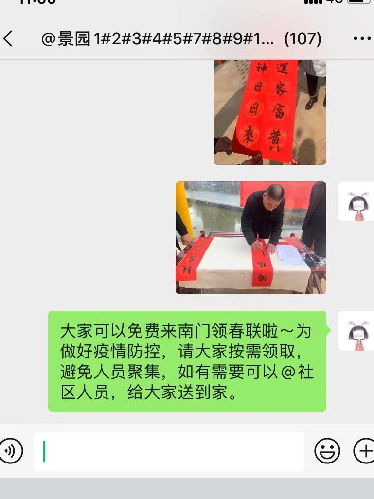2月3日,為做好社區(qū)防疫工作,周口市城鄉(xiāng)一體化示范區(qū)景園社區(qū)一改往年現(xiàn)場寫、集中送的免費送春聯(lián)活動形式,把“寫春聯(lián)”與“送春聯(lián)”分開,通過微信群向社區(qū)居民展示書法愛好者的春聯(lián)作品,讓居民在線挑選,按需有序領(lǐng)取,避免人群聚集。同時,針對社區(qū)老年人等行動不便群體,主動送春聯(lián)上門,確保送“福”與防疫兩不誤。