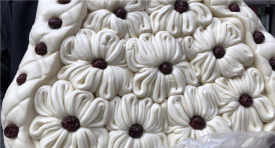 除了平常的白面饅頭,黃師傅還讓妻子現(xiàn)場展示了“棗山”制作,并介紹了棗山的寓意和習俗?!澳憧催@棗山是一層一層的,寓意著步步登高,而且棗山的花形是圓的,代表著團團圓圓。過去出嫁的閨女過年回娘家要帶大饃,娘家要回棗山,現(xiàn)在咱們周口的一些地方還保留著這樣的習俗。”兩位主播體驗了棗山的制作過程,得到黃老板妻子的夸獎:“中!這倆妮兒可巧!”