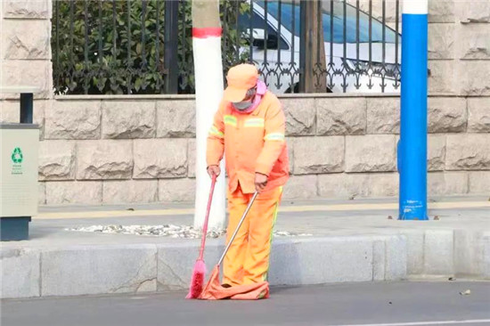 由于新冠肺炎疫情的原因,這個(gè)春節(jié)不同往常,環(huán)衛(wèi)工人們?cè)诟愫铆h(huán)衛(wèi)工作的同時(shí),還要注意好疫情防控。當(dāng)日上午,記者看到,每一名環(huán)衛(wèi)工人不僅全時(shí)段佩戴口罩,也會(huì)時(shí)常提醒路人戴好口罩,注意安全。