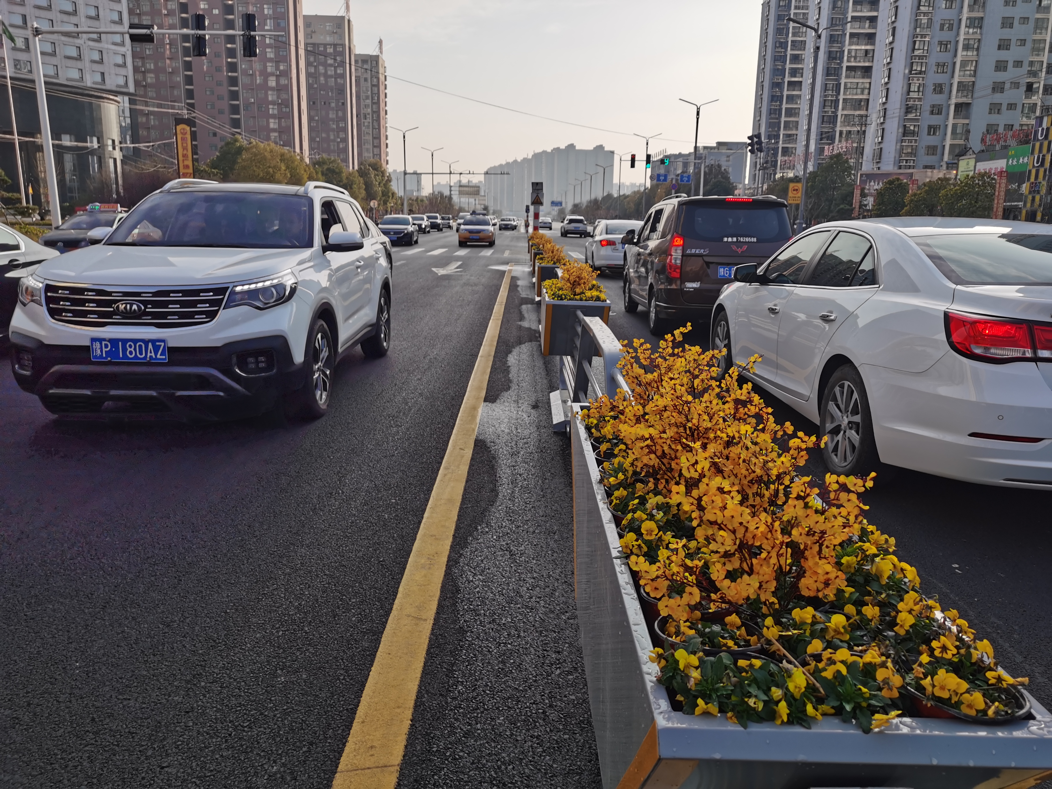 2月10日,走在商水縣陽城大道,發(fā)現(xiàn)快車道中間的欄桿換成帶花卉盒栽的新型欄桿,銀灰色的簡潔造型的欄桿、紅、藍、黃等各色花卉,扮靚了充滿節(jié)日喜慶氣氛的商水縣城。