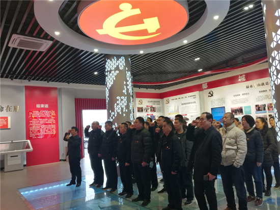 在宣誓臺(tái)前,全體黨員干部面對(duì)鮮紅的黨旗,高舉右手莊嚴(yán)宣誓,重溫入黨誓詞。