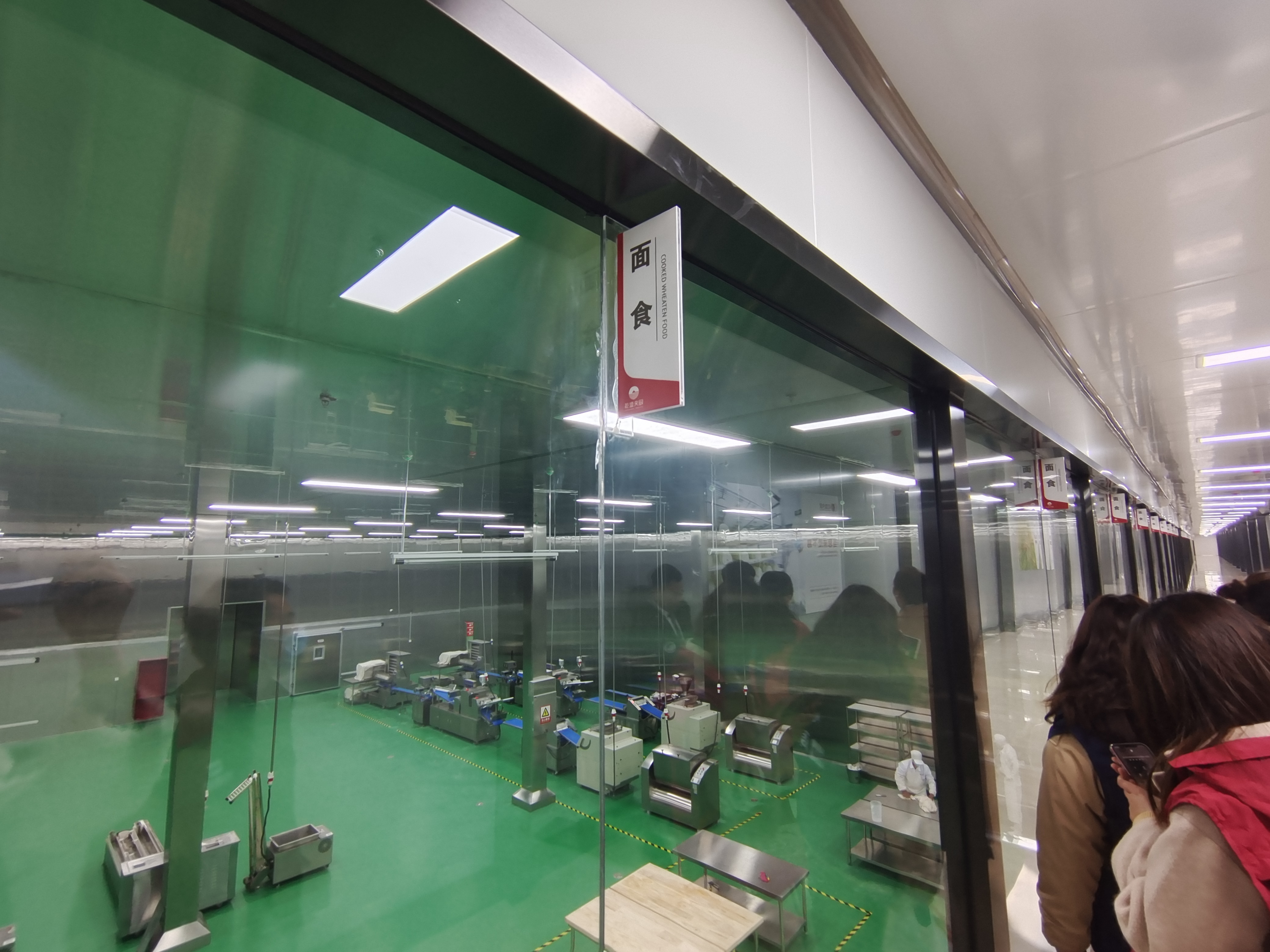 在位于川匯區(qū)女媧路88號(hào)的乾盛央廚,直播團(tuán)隊(duì)用圖文形式實(shí)時(shí)現(xiàn)場(chǎng)呈現(xiàn)午餐制作整體環(huán)境。隔著參觀走廊上的玻璃,全線開機(jī)一小時(shí)能出12000個(gè)無添加饅頭的面食車間,從生米到熟飯全自動(dòng)機(jī)械化制作的米飯車間,全程紫外線消毒、菜品全清真的烹飪車間,流水線上分盒分箱并與物流區(qū)無縫銜接的分餐生產(chǎn)線,這些在主播與乾盛央廚工作人員的一問一答中呈現(xiàn)在觀看直播的家長朋友們面前?!拔覀儾粌H做飯,餐具也由我們提供,餐具是PPP材料,耐高溫,安全無毒,筷子、勺子是不銹鋼的?!惫ぷ魅藛T介紹。