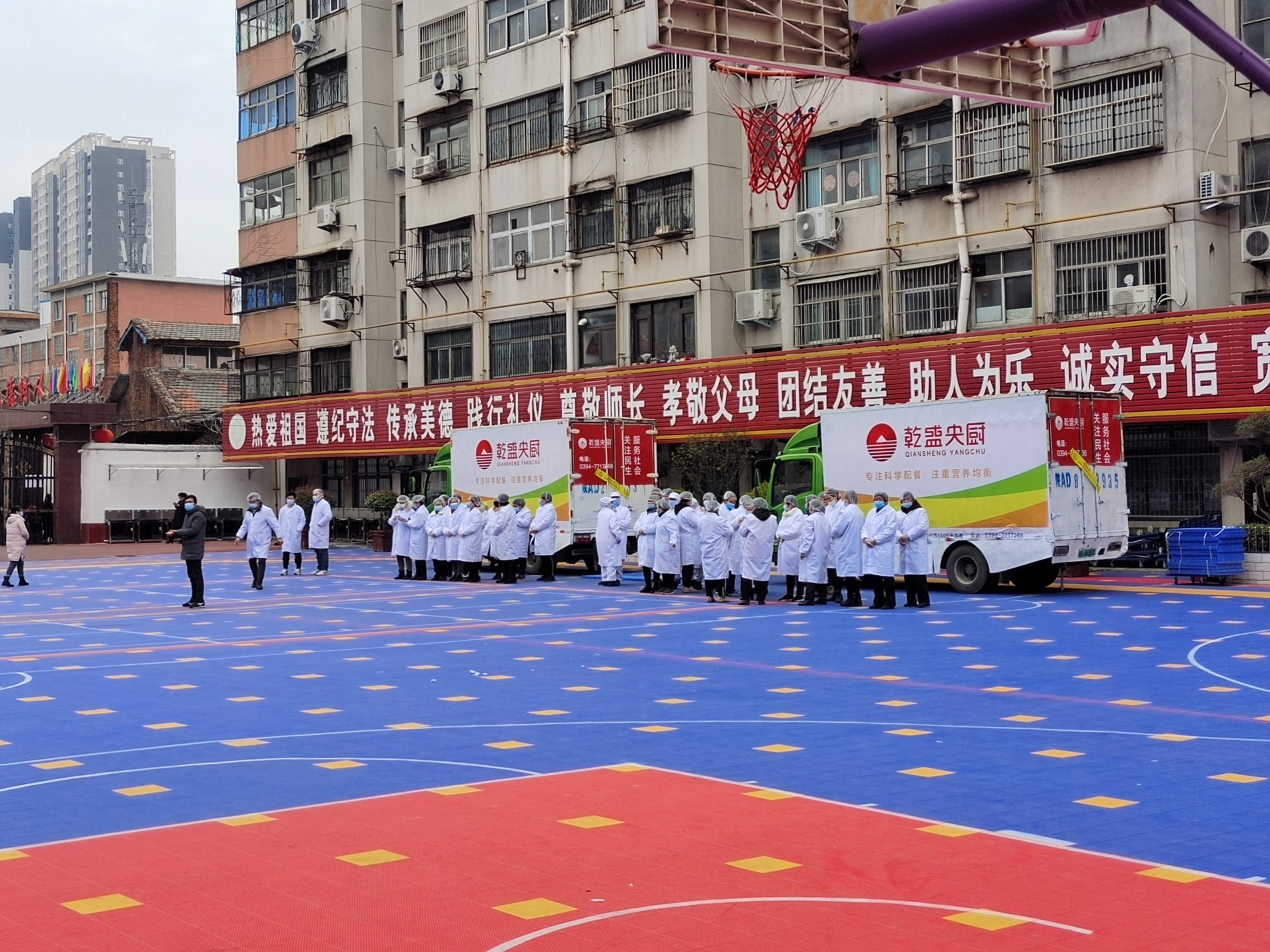 11時(shí)許,13000余份熱騰騰的飯菜即將送到周口市中心城區(qū)中小學(xué)生手中,直播團(tuán)隊(duì)對(duì)七一路二小的配送情況進(jìn)行現(xiàn)場(chǎng)直播。兩輛運(yùn)餐大卡車,20余名工作人員整裝待發(fā),乾盛央廚鄭州總公司的營銷部負(fù)責(zé)人現(xiàn)場(chǎng)指揮調(diào)度七一路二小的發(fā)餐工作。揭掉卡車上的封條,留樣,測(cè)溫,裝車,按班分送,分發(fā)不銹鋼餐具,“哇!獅子頭!!”在孩子們的驚呼聲中,兩葷一素,一份米一份湯,熱氣騰騰地盛到孩子手中的餐具中。“孩子們吃不吃的飽呀?”面對(duì)各直播平臺(tái)上網(wǎng)友的提問,乾盛央廚鄭州總公司營銷部負(fù)責(zé)人回答:“我們提前有準(zhǔn)備,飯、菜我們都免費(fèi)加,保證孩子們都吃飽,請(qǐng)家長朋友們放心?!?/p>