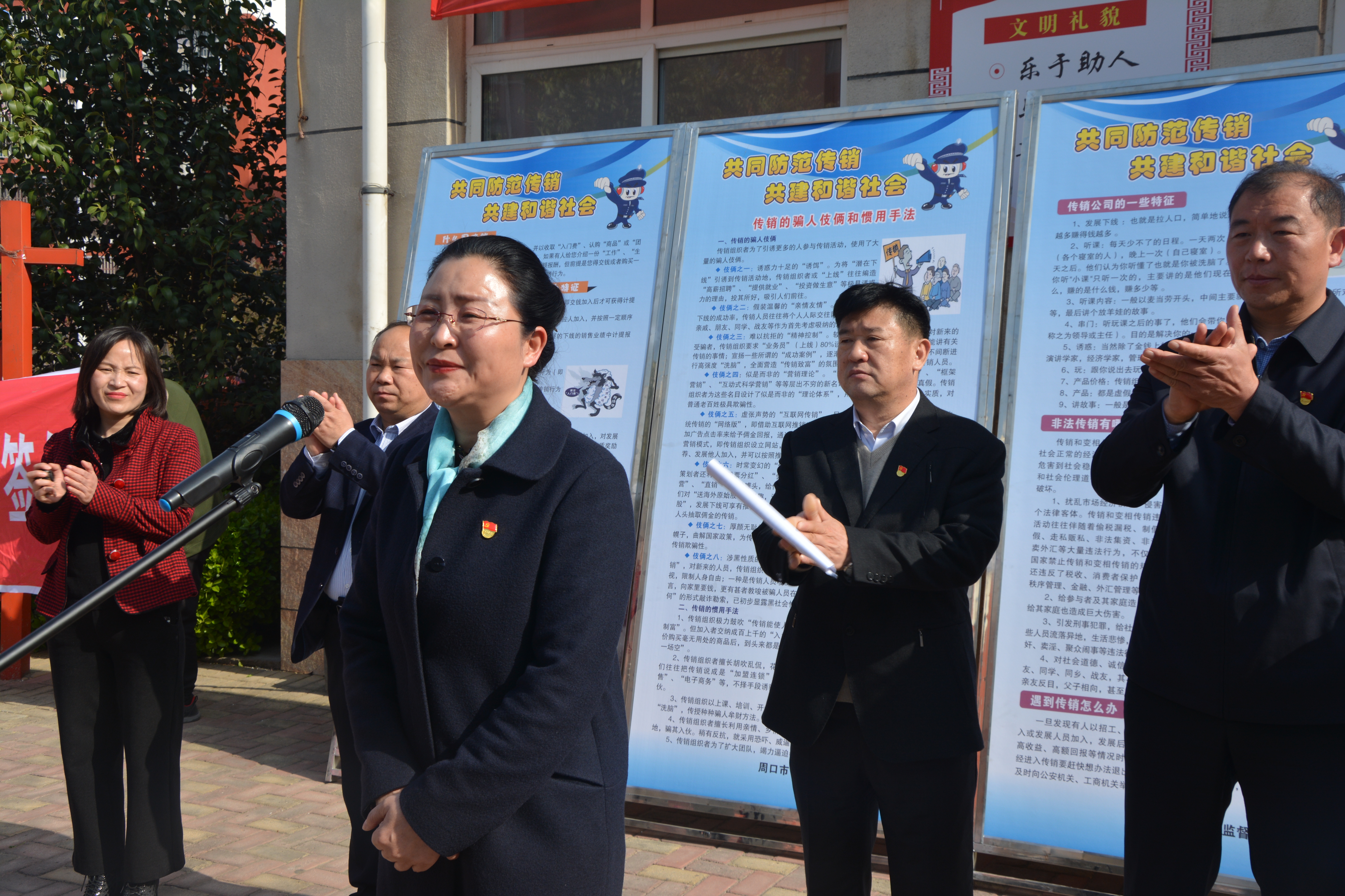 市市場(chǎng)監(jiān)管局二級(jí)高級(jí)主辦王樹平,港區(qū)打擊傳銷工作領(lǐng)導(dǎo)小組組長(zhǎng)、黨委委員、紀(jì)委書記李素芹出席活動(dòng),市市場(chǎng)監(jiān)管局公平交易科科長(zhǎng)豐亞偉、主任科員孟金鳳,港區(qū)管委會(huì)維穩(wěn)創(chuàng)新辦、安全辦、李埠口鄉(xiāng)政府負(fù)責(zé)人,周口市公安局港區(qū)分局民警輔警代表、各行政村分管同志、三個(gè)小區(qū)物業(yè)公司代表,市場(chǎng)監(jiān)管局港區(qū)分局全體同志,周口日?qǐng)?bào)社等新聞單位以及前來參觀的群眾參加了活動(dòng)。港區(qū)打擊傳銷工作領(lǐng)導(dǎo)小組辦公室主任、市場(chǎng)監(jiān)管局港區(qū)分局局長(zhǎng)崔健作創(chuàng)建動(dòng)員講話。他指出,嚴(yán)厲打擊傳銷違法行為,增強(qiáng)廣大群眾識(shí)別傳銷、抵制傳銷的能力,發(fā)動(dòng)社會(huì)力量群防群控,是加強(qiáng)平安建設(shè),打造平安港區(qū),進(jìn)一步促進(jìn)社會(huì)和諧穩(wěn)定的重要舉措。開展無傳銷社區(qū)村創(chuàng)建活動(dòng),就是動(dòng)員全社會(huì)特別是基層派出所、市場(chǎng)監(jiān)管所、社區(qū)(村)等力量,展開群防群控,重點(diǎn)加強(qiáng)對(duì)流動(dòng)人口密集、情況復(fù)雜區(qū)域的檢查力度,形成縱橫交錯(cuò)、內(nèi)外結(jié)合、上下聯(lián)動(dòng)的網(wǎng)格體系,全力擠壓傳銷活動(dòng)生存空間,始終保持對(duì)傳銷的高壓態(tài)勢(shì),增強(qiáng)群眾抵制傳銷的自覺性和積極性,鏟除傳銷滋生的土壤,推進(jìn)打擊傳銷工作再上新臺(tái)階。