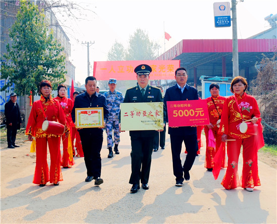 “來啦,來啦!”在鏗鏘激越的鑼鼓聲中,鹿邑縣人武部政委李峰、退役軍人事務局有關領導和賈灘鎮(zhèn)黨委、政府負責人一行人高舉“一人立功、全家光榮”的條幅闊步前來,共同將二等功臣馮秋月的立功喜報和“二等功臣之家”牌匾、獎金、慰問品送到了她父母手中。村民紛紛趕來涌進軍屬的庭院,為功臣馮秋月點贊,向她的家人鼓掌祝賀。