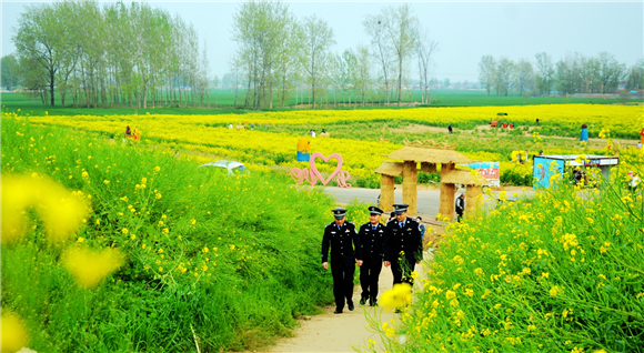 4月10日上午,商水縣公安局組織民警在鄧城鎮(zhèn)6000多畝油菜花海中執(zhí)勤巡邏,疏導(dǎo)交通,確保游客安全。當(dāng)日,商水縣首屆金色花田樂游匯暨農(nóng)特產(chǎn)品展銷會開幕式在此舉行。來自市內(nèi)外的數(shù)萬名游客到這里踏青賞春。