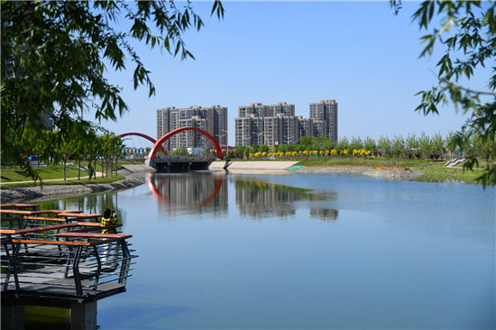 眼下雖不是詞中所描繪的初春時(shí)節(jié),但是暮春的水系風(fēng)光更具詩(shī)情畫(huà)意。女?huà)z路魚(yú)翔湖是一處以水凈化、水景觀、水科普為主的濱河濕地游園。漫步于此,新綠點(diǎn)綴其中,步道曲徑通幽,河水清澈透明,頓覺(jué)神清氣爽。沙河玉盤(pán)落珠節(jié)點(diǎn),曲廊環(huán)繞,波光鱗鱗,垂柳慢舞,河流猶如飄帶蜿蜒流淌,一路步行聞花香聽(tīng)鳥(niǎo)鳴,繪出一幅唯美畫(huà)卷。②9