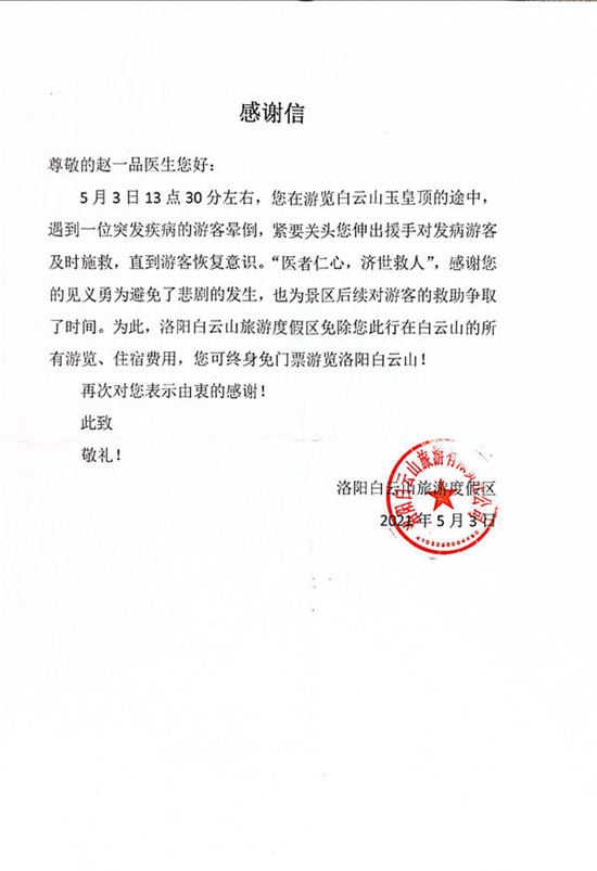 得知趙醫(yī)生見(jiàn)義勇為的事跡后,洛陽(yáng)白云山旅游度假區(qū)對(duì)趙一品醫(yī)生送出了感謝信,免除他此行在白云山的所有游覽、住宿費(fèi)用,并可終身免門(mén)票游覽洛陽(yáng)白云山。