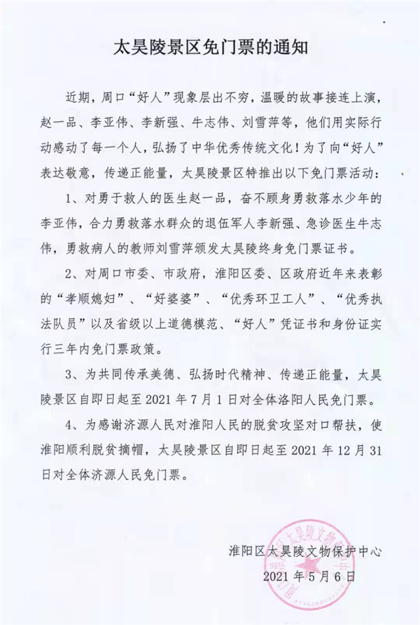 同時,為共同傳承美德、弘揚時代精神、傳遞正能量,太昊陵景區(qū)自即日起至2021年7月1日對全體洛陽人民免門票;為感謝濟源人民對淮陽人民的脫貧攻堅對口幫扶,使淮陽順利脫貧摘帽,太昊陵景區(qū)自5月6日起至2021年12月31日對全體濟源人民免門票。②7